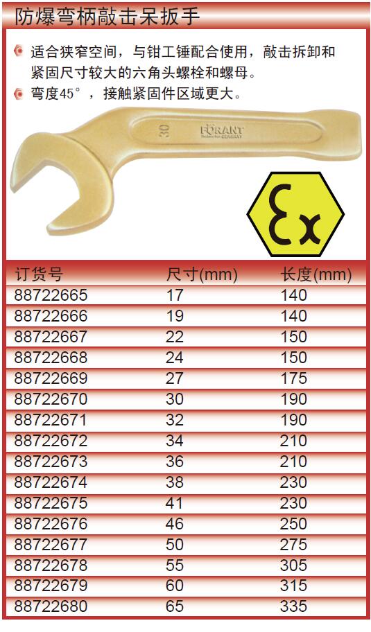 ·经久耐用,产品物美价廉 ·适合狭窄空间,与钳工锤配合使用,敲击拆卸和紧固尺寸较大的六角头螺栓和螺母。 ·弯度45°,接触紧固件区域更大。