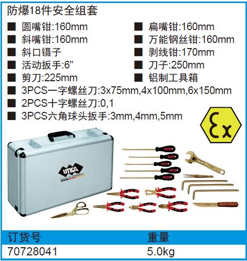J12607 70728041 18件套 防爆金属 1套/箱 ·圆嘴钳:160mm ·扁嘴钳:160mm ·斜嘴钳:160mm ·万能钢丝钳:160mm ·斜口镊子 ·剥线钳:170mm ·活动扳手:6" ·刀子:250mm ·剪刀:225mm ·铝制工具箱 ·3PCS一字螺丝刀:3×75mm,4×100mm,6×150mm ·2PCS十字螺丝刀:0,1 ·3PCS六角球头扳手:3mm,4mm,5mm 52766.80