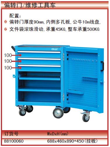 ·配置: ·偏转门厚度90mm,内侧多孔板,公牛10m线盘, ·文件袋滚珠滑动,承重45KG,整车承重500KG ·450(挂板)