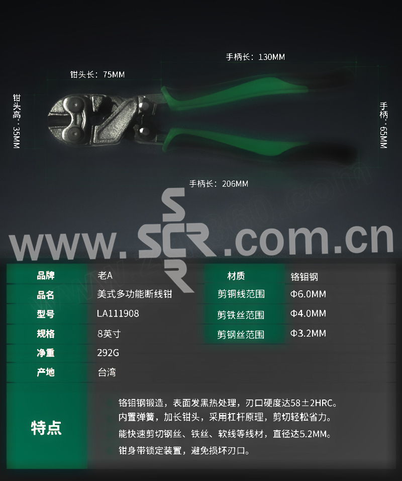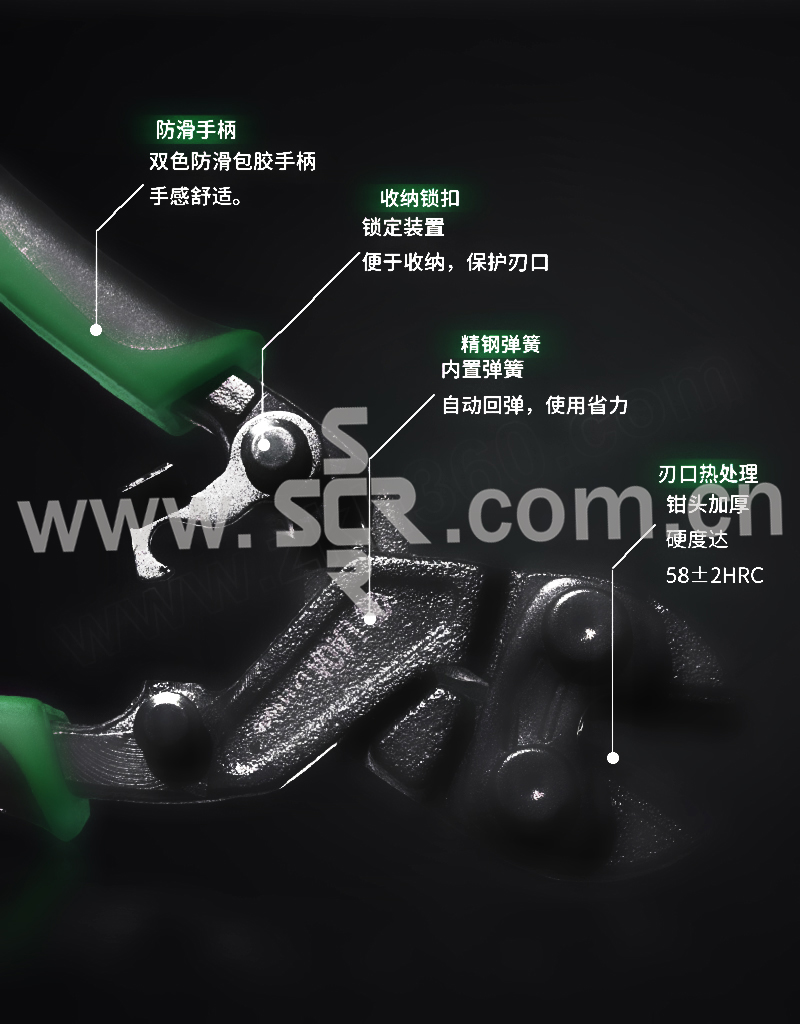 ·铬钼钢制造,高频淬火,硬度高,耐磨耐用,剪切能力强,握感舒适。