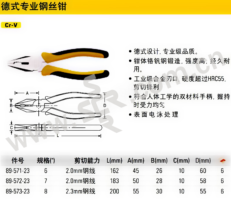 ·德式设计,专业级品质 ·钳体铬钒钢锻造,强度高,经久耐用 ·工业级合金刃口,硬度超过HRC55,剪切锋利,使用寿命提高30% ·符合人体工学的双材料手柄,握持时受力均匀,不易疲劳 ·表面电泳处理,防锈能力提升100% ·符合或超过ANSI标准