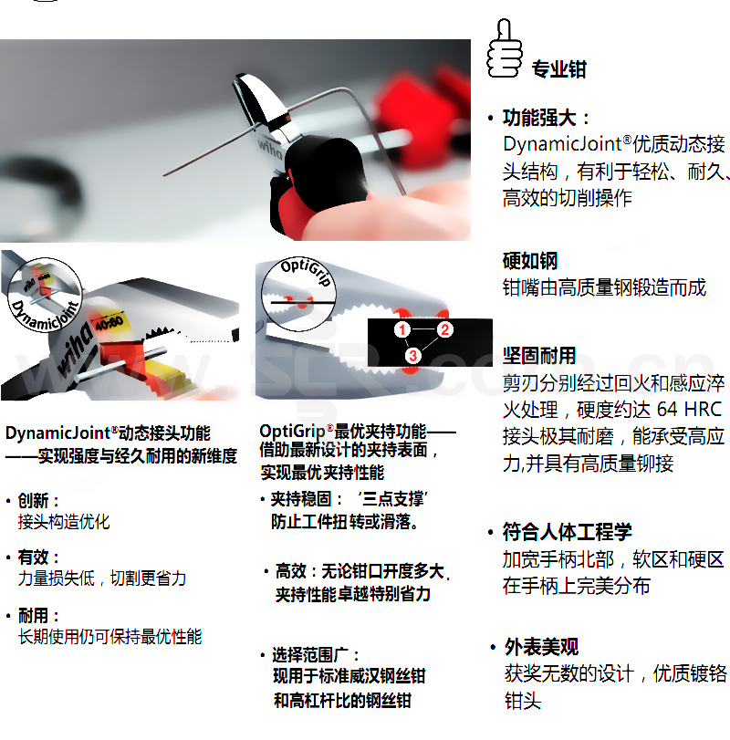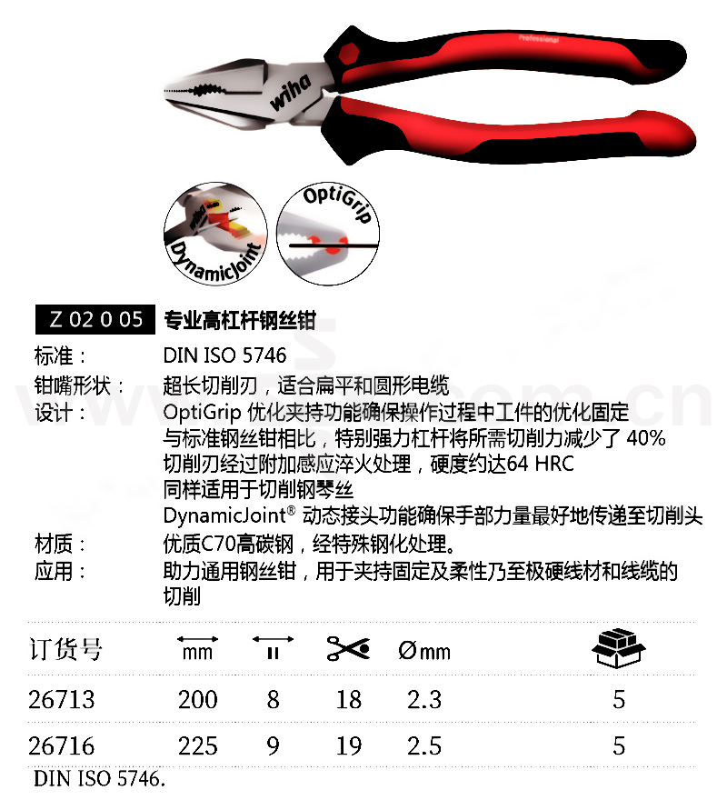 ·标准:DINISO5746·超长切削刃,适合扁平和圆形电缆·OptiGrip优化夹持功能确保操作过程中工件的优化固定·与标准钢丝钳相比,特别强力杠杆将所需切削力减少了40r/>切削刃经过额外感应淬火处理,硬度约达64HRC。·DynamicJoint动态接头功能确保手部力量地传递至切削头·材质:优质C70高碳钢,经特殊钢化处理。