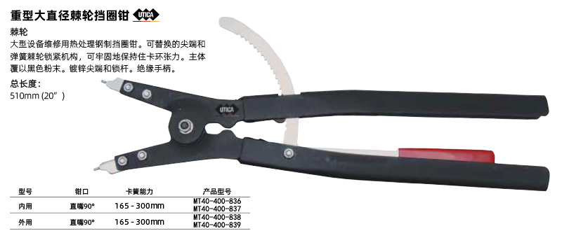 ·大型设备维修用热处理钢制挡圈钳。可替换的尖端和弹簧棘轮锁紧机构,可牢固地保持住卡环张力。主体覆以黑色粉末。镀锌尖端和锁杆。绝缘手柄。