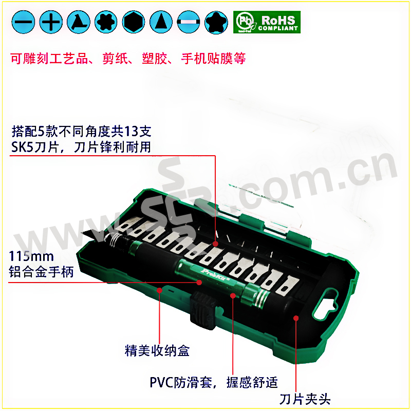 ·手柄采用铝合金制成,并具PVC防滑套和灵活旋转尾盖,握感舒适,操作轻巧 ·可更换刀片满足不同应用需求 ·小巧轻便,具刀片定位弹挂槽设计,携带方便,精巧收纳 ·专为雕刻工艺品、剪纸、塑料等,所开发的精致刀具组