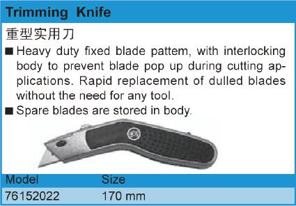 ·重型固定刀片模板,具有联锁,机身防止切割过程中刀片弹出皱纹。钝叶片快速更换不需要任何工具。备用刀片储存在体内。