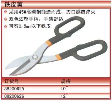 ·采用45#高碳钢锻造而成,刃口感应淬火 ·双色沾塑手柄,手感舒适 ·可剪0.5mm以下铁皮