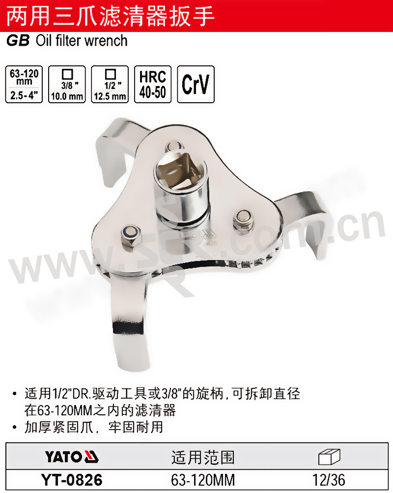 ·适用1/2"DR。驱动工具或3/8"的旋柄,可拆卸直径在63-120MM之内的滤清器。