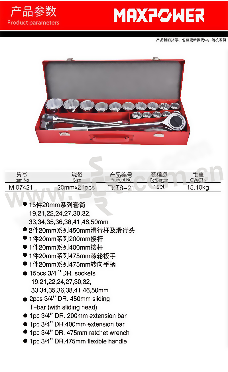 MAXPOWER/力钰 21件套20mm系列公制套筒组套 M07421 20mm 1套