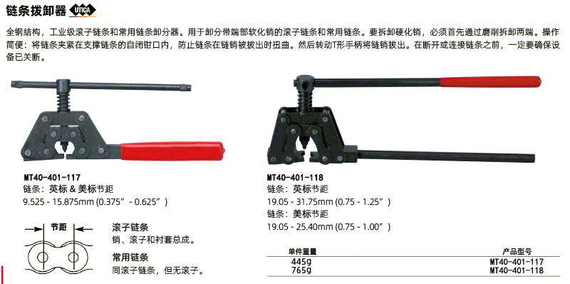 ·全钢结构,工业级滚子链条和常用链条拨卸器。