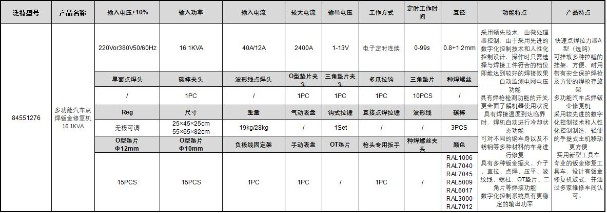 A31630 84551276 采用国际领先技术,由微处理器控制,由于采用先进的数字化控制技术和人性化控制设计,操作时只需选择与焊接工件符合的档位即能达到较好的焊接效果独特的自动监测电网电压功能 具有焊枪检测功能的开关,更全面了解机器使用状况 具有焊接温度到达临界时,焊机自动进行冷却状态功能 可对不同的钢车身以及不锈钢等多种材料的车身进行修复 具有多种钣金缩火、介子、直拉、点焊、压平、波纹线、螺柱、OT垫片、三角片等焊接功能 数字化控制系统具有更稳定的输出功率 220Vor380V50/60Hz 16.1KVA 40A/12A 2400A 1-13V 电子定时连续 0-99s 0.8+1.2mm 无极可调 25×45×25cm 55×65×82cm 19kg/28kg / 1Set / / 3PCS / 7260.00