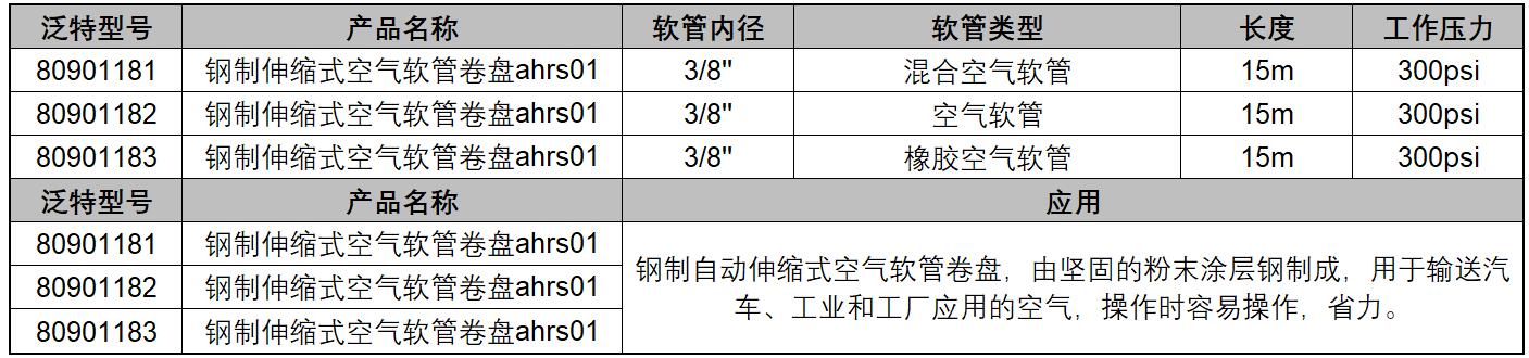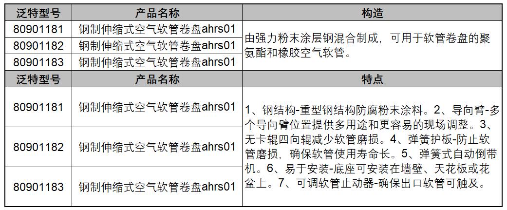 ·应用:AHRS01钢制自动伸缩式空气软管卷盘,由坚固的粉末涂层钢制成,用于输送汽车、工业和工厂应用的空气,操作时更容易操作,省力。