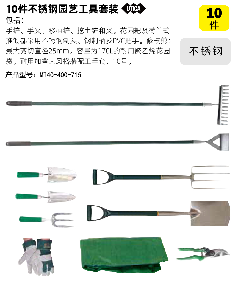 手铲、手叉、移植铲、挖土铲和叉。花园耙、荷兰式推锄、草坪耙全采用碳钢头、铝柄和软橡胶把手。修枝剪:最大剪切直径25mm。容量为170L的耐用聚乙烯花园袋。耐用加拿大风格装配工手套,10号。