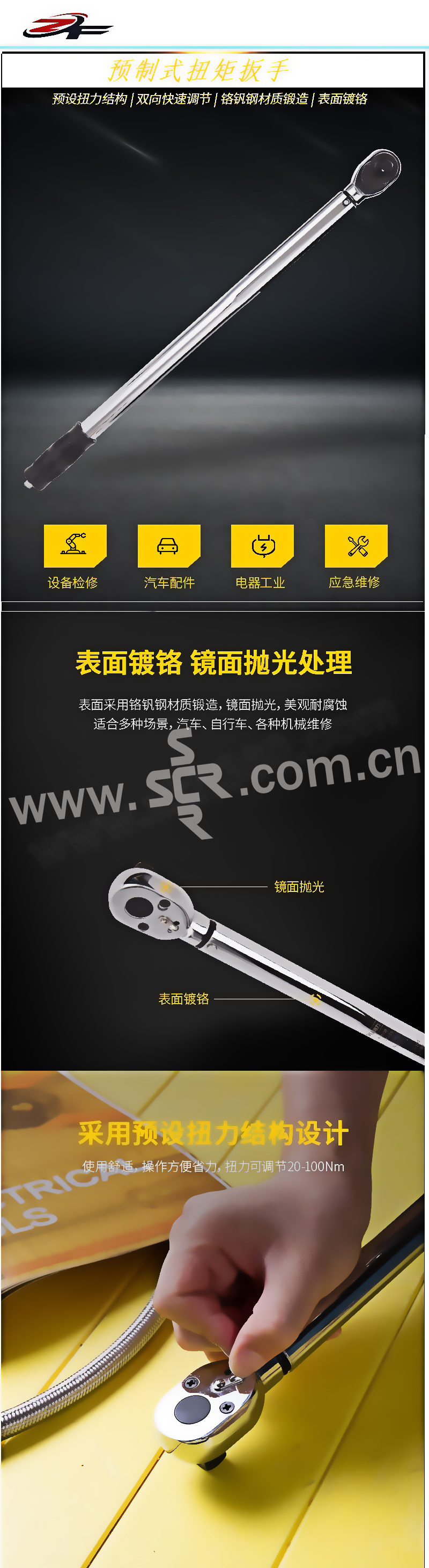 ·采用CR-V铬钒钢材质,双向棘轮设计,40CR冷拉钢管,表面镀铬,力矩刻度设微分装置。五级精度,