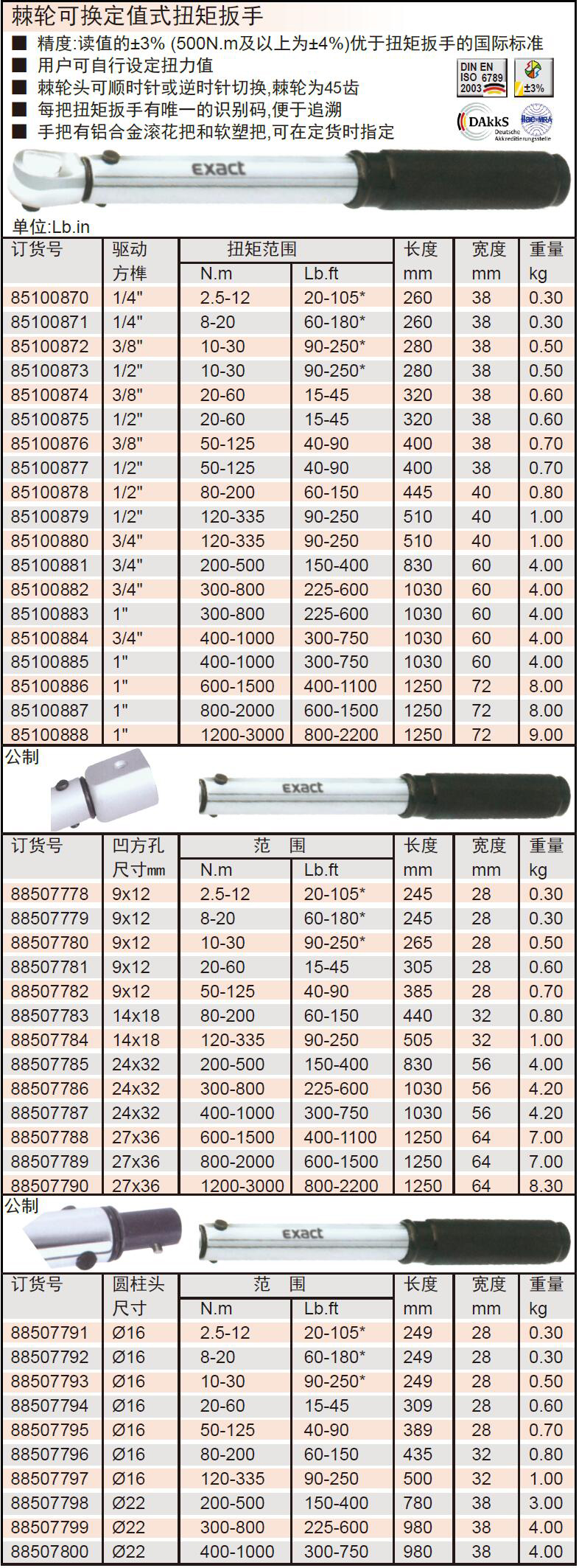 ·产品特点: ·用户可自行设定所需的扭矩值 ·唯一的扭矩定值点,不可随意调整扭矩值,使用时更能保证产品质量有不同的头部型式,棘轮、方孔和圆柱头 ·精度为读值的±3%(500N.m以上为±4%)