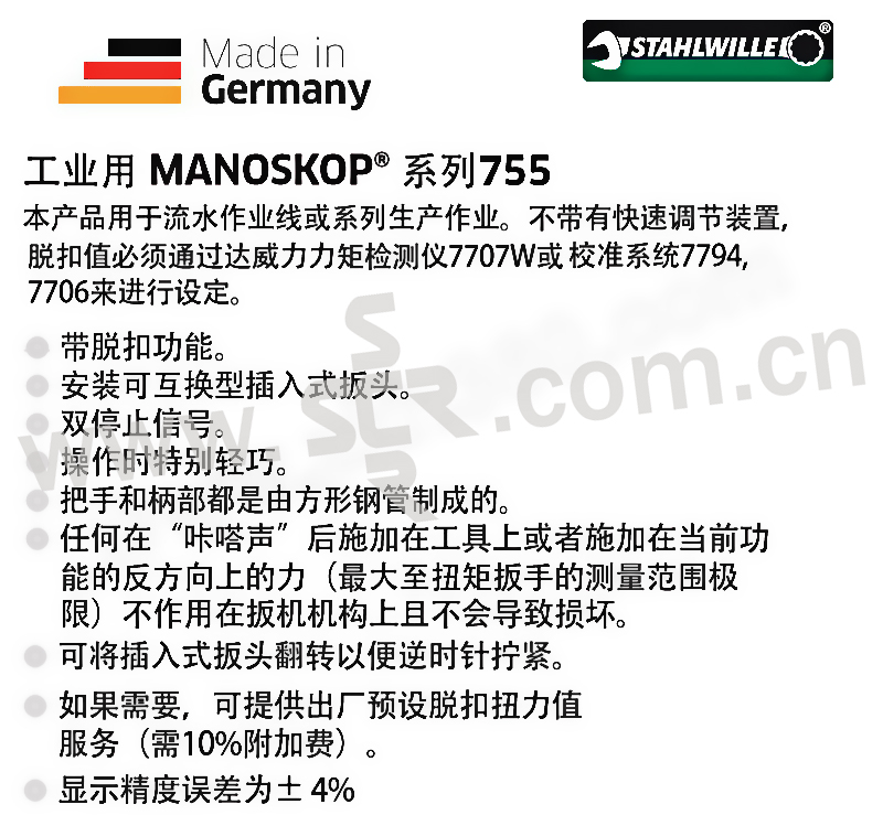 ·带脱扣功能·安装可互换型插入式扳头·双停止信号。·操作时特别轻巧。·把手和柄部都是由方形钢管制成的。·任何在“咔嗒声”后施加在工具上或者施加在当前功能的反方向上的力(不超过扭矩扳手的测量范围极限)不作用在扳机机构上且不会导致损坏。·可将插入式扳头翻转以便逆时针拧紧。·如果需要,可提供出厂预设脱扣扭力值服务(需10%附加费)。·显示精度误差为±4%