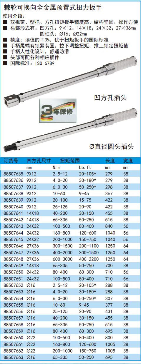 ·双视窗、塑把、方孔扭矩扳手精度高、结构坚固、操作方便 ·头部形式有:凹方孔:9×12;14×18;24×32;27×36mm圆柱头:Ø16;Ø22mm ·精度:读值的±3%,优于扭矩扳手的国际标准 ·手柄尾端有锁紧装置,拉下调整扭矩,推上锁定扭矩值 ·手柄人性化设计,舒适防滑 ·头部可配各种相应插件 ·国际标准:ISO6789