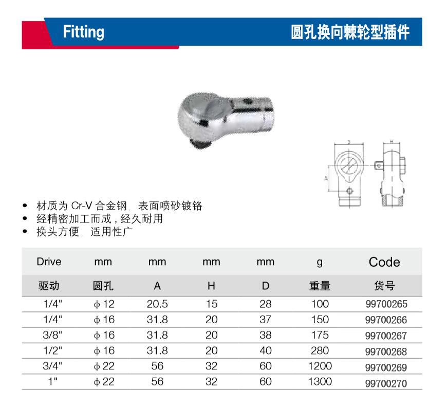 · 材质为Cr-V 合金钢,表面喷砂镀铬 · 经精密加工而成, 经久耐用 · 换头方便,适用性广