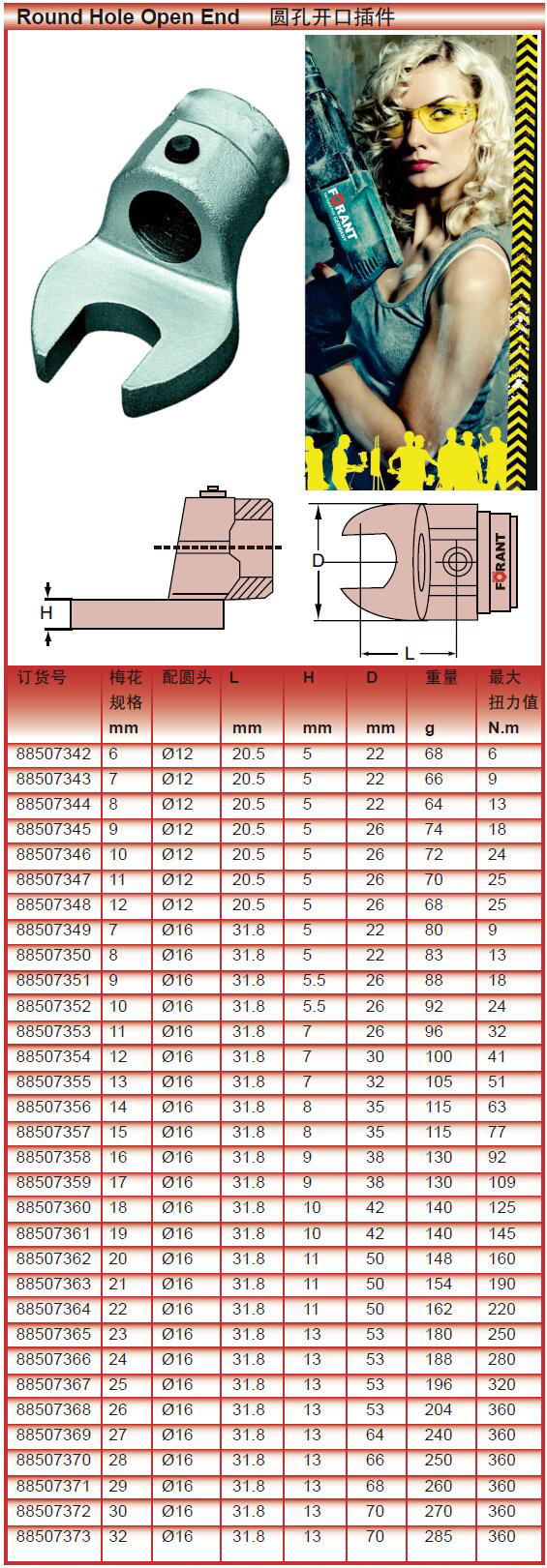 订货号 制造商型号 规格 材质 可换头部尺寸 中心距 头部宽度 头部厚度 最大扭矩 表面处理 重量 价格 购物车
