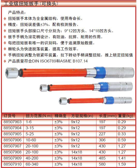 订货号 制造商型号 扭矩范围 扭矩精度 可换头部尺寸 长度 扭矩显示 报警模式 重量 价格 购物车