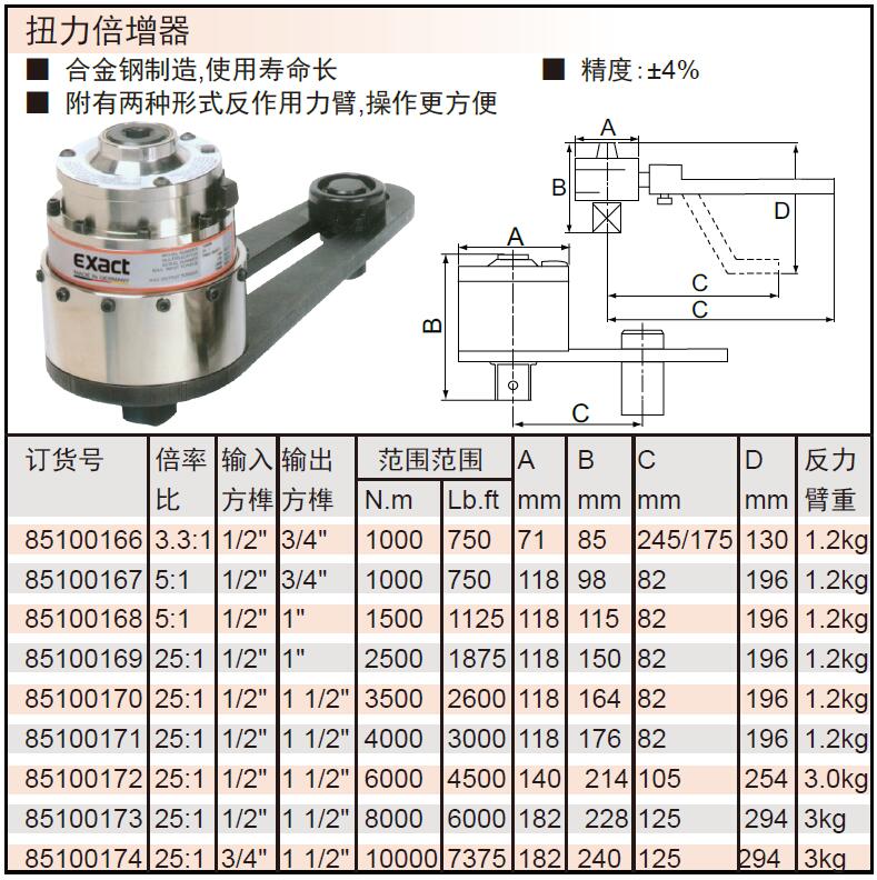 ·合金钢制造,使用寿命长 ·精度:±4% ·附有两种形式反作用力臂,操作更方便