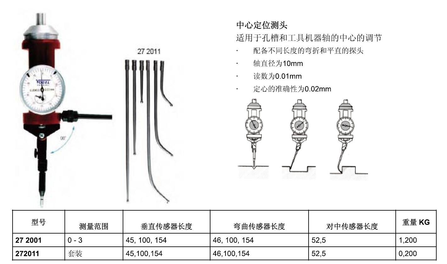 ·适用于孔槽和工具机器轴的中心的调节 ·配备不同长度的弯折和平直的探头 ·轴直径为10mm ·读数为0·01mm ·定心的准确性为0·02mm