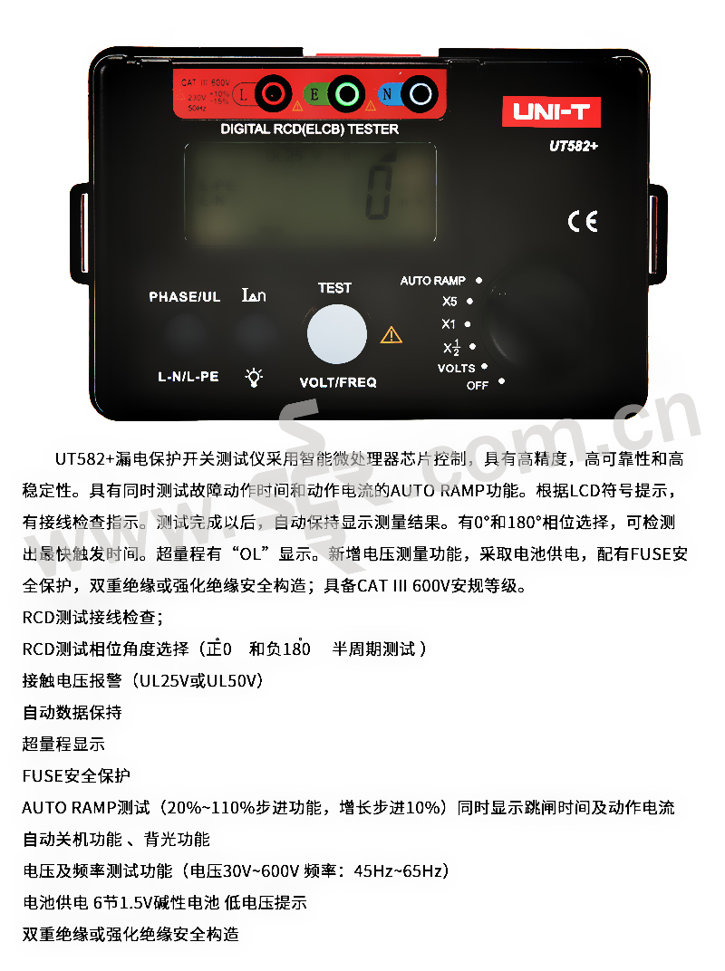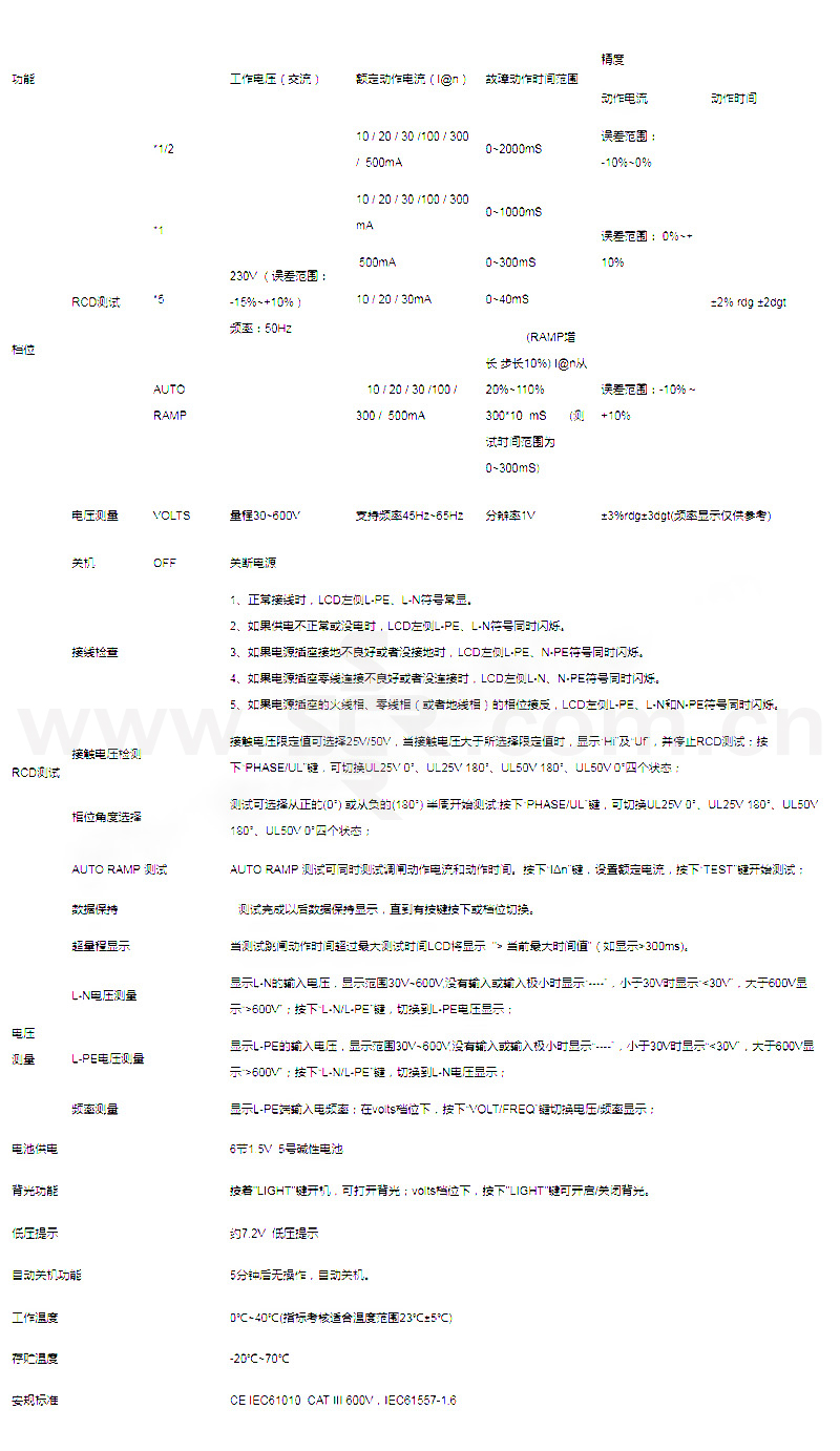 ·RCD测试接线检查;·RCD测试相位角度选择正0〫和负180〫半周期测试·接触电压报警UL25V或UL50V·自动数据保持·超量程显示·FUSE安全保护·AUTORAMP测试20%~110%步进功能,增长步进10%同时显示跳闸时间及动作电流·自动关机功能、背光功能·电压及频率测试功能电压30V~600V频率:45Hz~65Hz·电池供电6节1.5V碱性电池低电压提示·双重绝缘或强化绝缘安全构造