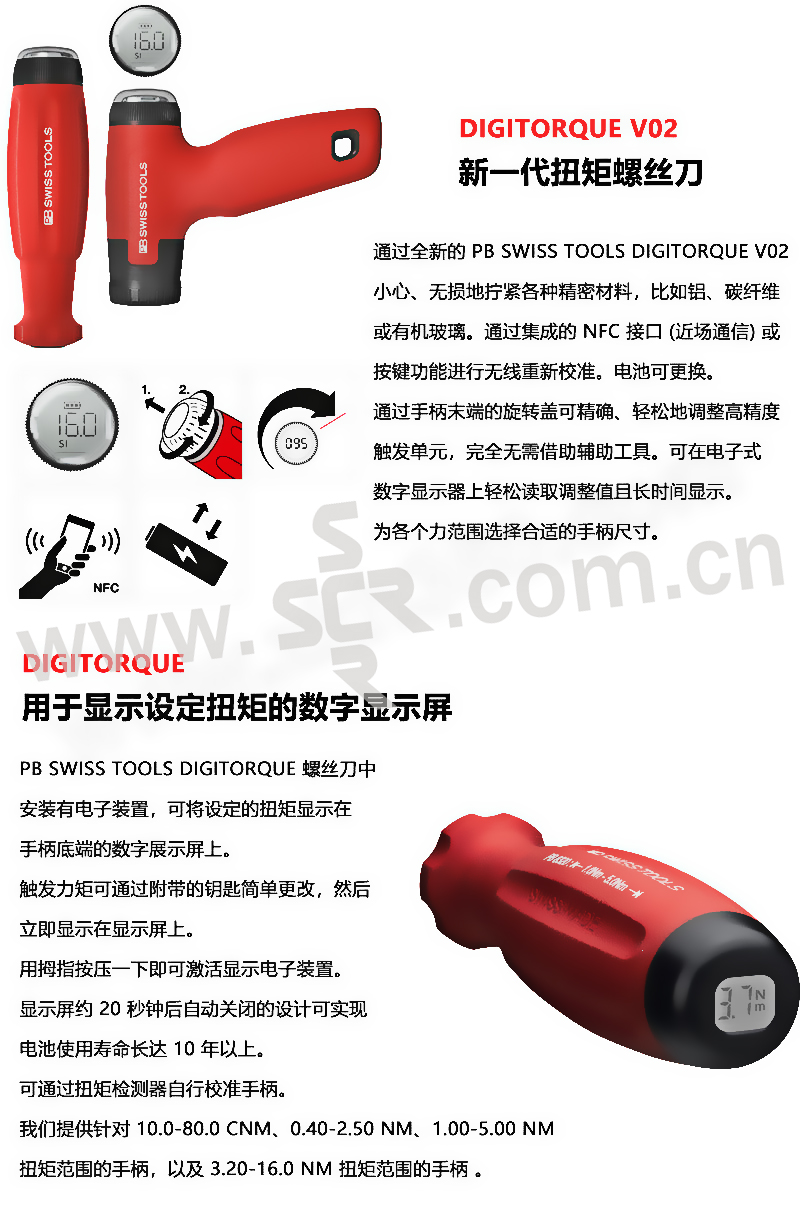 ·可以轻松识别显示屏的设定值,无需借助工具即可调节扭矩,电池可更换,NFC近场通信,短距离连接,用于传输少量数据,建立连接所需时间短,耗电量小。新型独特的测力装置,轻松调节扭矩