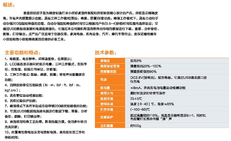 ·高精度、高分辨率、采样速度快、全屏显示; ·LCD液晶显示器同时显示电量、三种工作模式、扭矩单位、扭矩值、扭矩方向标记、计数值; ·三种工作模式:跟踪、峰值、预置;带有声光报警提示功能; ·具有零位自动校准功能; ·具有过载保护功能; ·峰值模式下具有手动或自动存储200组扭矩峰值的功能; ·可通过USB数据线连接电脑进行数据下载、查看、分析备份、删除、打印输出等;