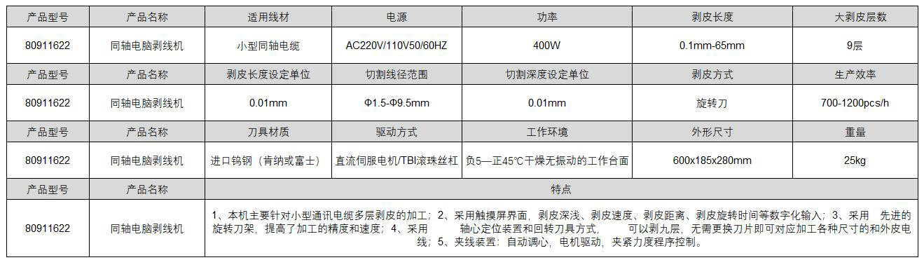.本机主要针对小型通讯电缆多层剥皮的加工; .采用触摸屏界面,剥皮深浅、剥皮速度、剥皮距离、剥皮旋转时间等数字化输入; .采用较先进的旋转刀架,提高了加工的精度和速度; .采用特定的轴心定位装置和回转刀具方式,较多可以剥九层,无需更换刀片即可对应加工各种尺寸的和外皮电线; .夹线装置:自动调心,电机驱动,夹紧力度程序控制。