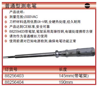 ·测量范围≤500VAC ·刀杆材料选用优质CR-V钢,全硬热处理,经久耐用 ·产品达到CE标准,安全可靠 ·88259403带笔架,笔架采用高弹性钢,电镀处理携带方便 ·请勿作为普通螺丝刀使用 ·使用前请对已知电源检测,确保电笔功能正常