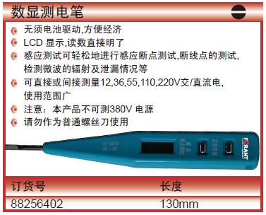 ·无须电池驱动,方便经济 ·LCD 显示,读数直接明了 ·感应测试可轻松地进行感应断点测试,断线点的测试, ·检测微波的辐射及泄漏情况等 ·可直接或间接测量12,36,55,110,220V交/直流电, ·使用范围广 ·注意:本产品不可测380V 电源 ·请勿作为普通螺丝刀使用