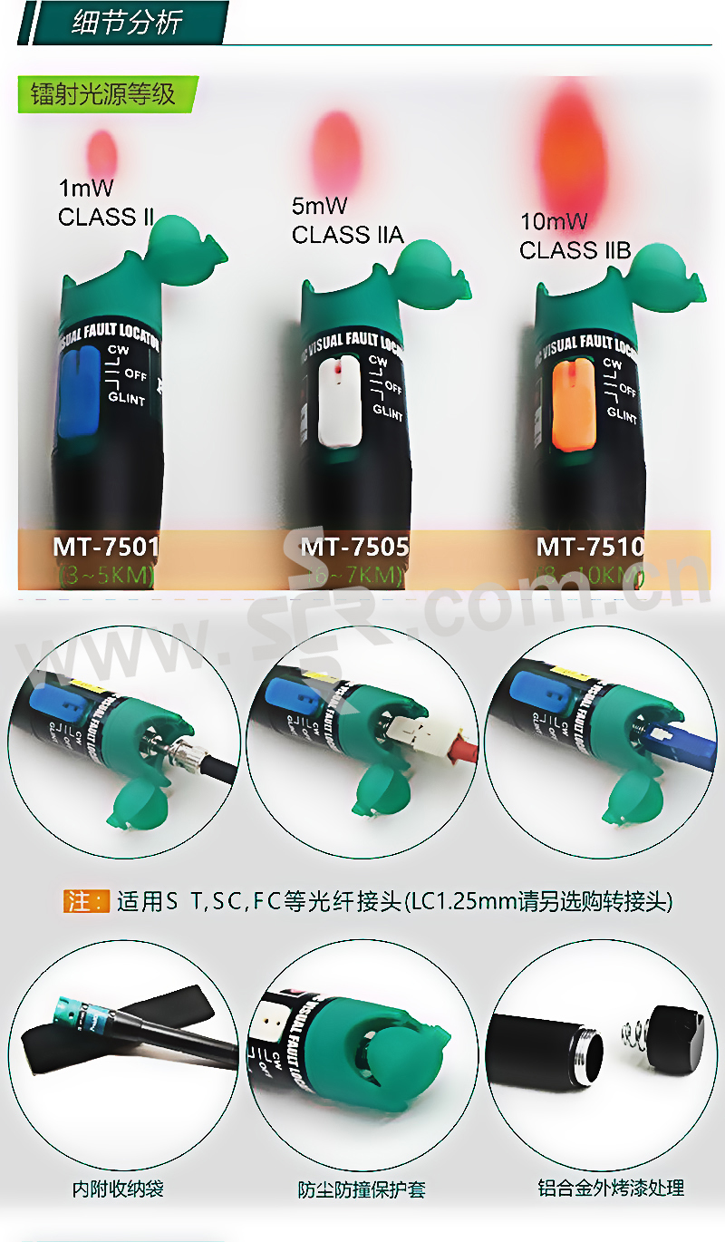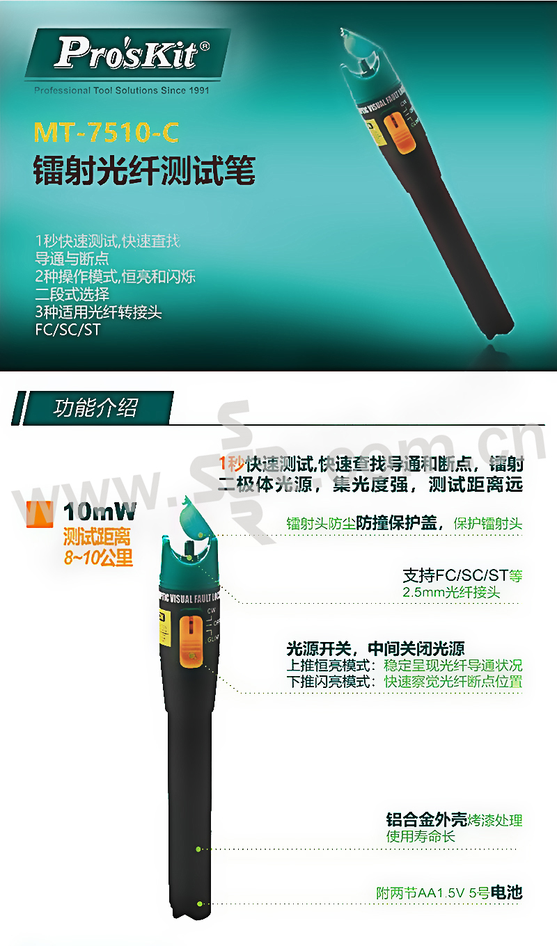 ·宝工镭射光纤测试笔是专为需求简易光纤测试所设计,提供恆亮及闪烁模式来快速测试导通及查找断点,是一款方便又快速的测试工具。·1秒快速测试,快速查找导通与断点:采用镭射二极体设计,集光度强,测试距离远。·2 种操作模式,恆亮和闪烁二段式选择:恆亮模式:可以稳定呈现光纤导通状况。·闪烁模式:可以快速查觉光纤断点位置。·3种适用光纤转接头FC/SC/ST支援FC /SC /ST等 2.5mm 光纤接头。