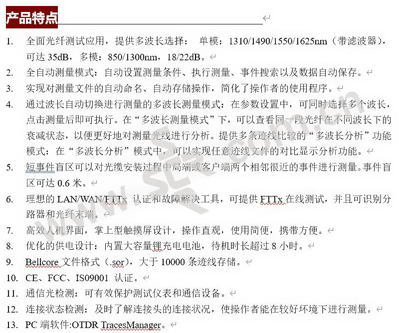 ·全面光纤测试应用,提供多波长选择:单模:1310/1490/1550/1625nm(带滤波器),可达35dB,多模:850/1300nm,18/22dB