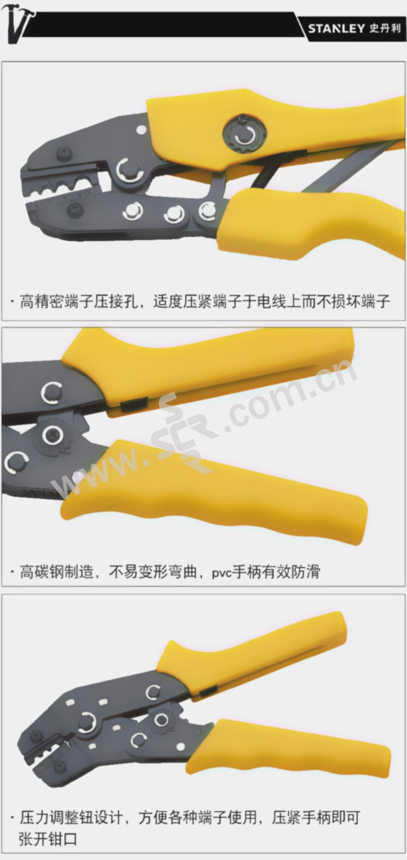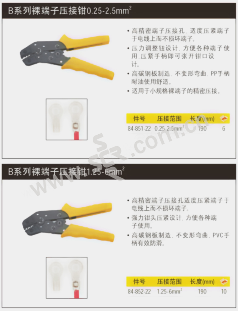 ·高精密端子压接孔,适度压紧端子于电线上而不损坏端子。 ·压力调整钮设计,方便各种端子使用,独特压紧手柄即可张开钳口设计。 ·高碳钢板制造,不变形弯曲,PP手柄耐油使用舒适。 ·适用于小规格绝缘端子的精密压接。