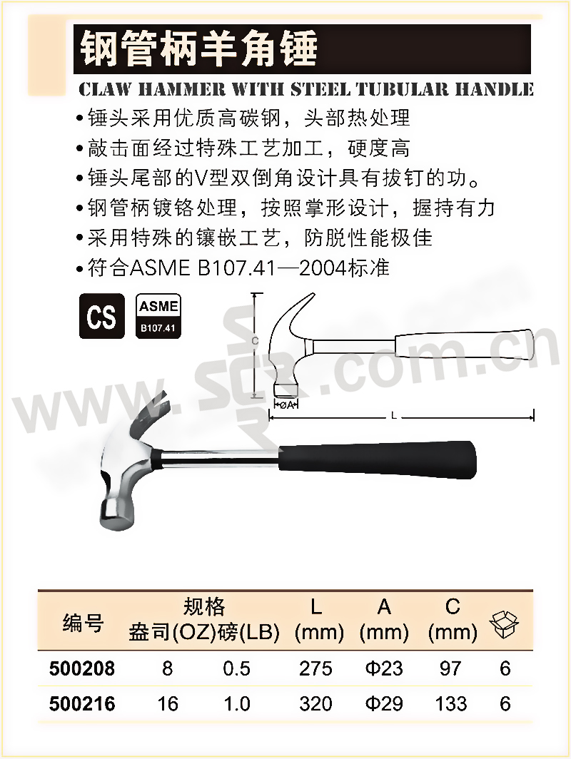 ·锤头采用优质高碳钢,头部热处理,大幅提升了锤头的使用寿命;·敲击面经过特殊工艺加工,硬度高·锤头尾部的V型双倒角设计具有拔钉的功·钢管柄镀铬处理,按照掌形设计,握持有力·采用特殊的镶嵌工艺,防脱性能好