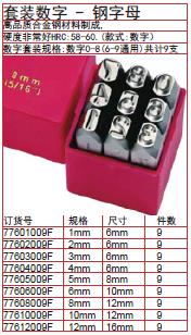 ·高品质合金钢材料制成.硬度非常好HRC:58-60. ·数字套装:0-8(6和9通用,共计9支)字母套装:英文A-Z和&,共计27支