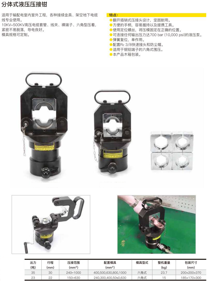 ·翻开插销式压接头设计,坚固耐用。 ·方便的手柄,容易握持以及提携工具。 ·使用定位螺丝,将压模固定在正确的位置。 ·可连接任何输出压力达700 bar (〔10,0o0 psi)的液压泵。 ·弹簧复位,单作用。 ·适用于铜铝端子的六角式围压。 ·本产品木箱包装。