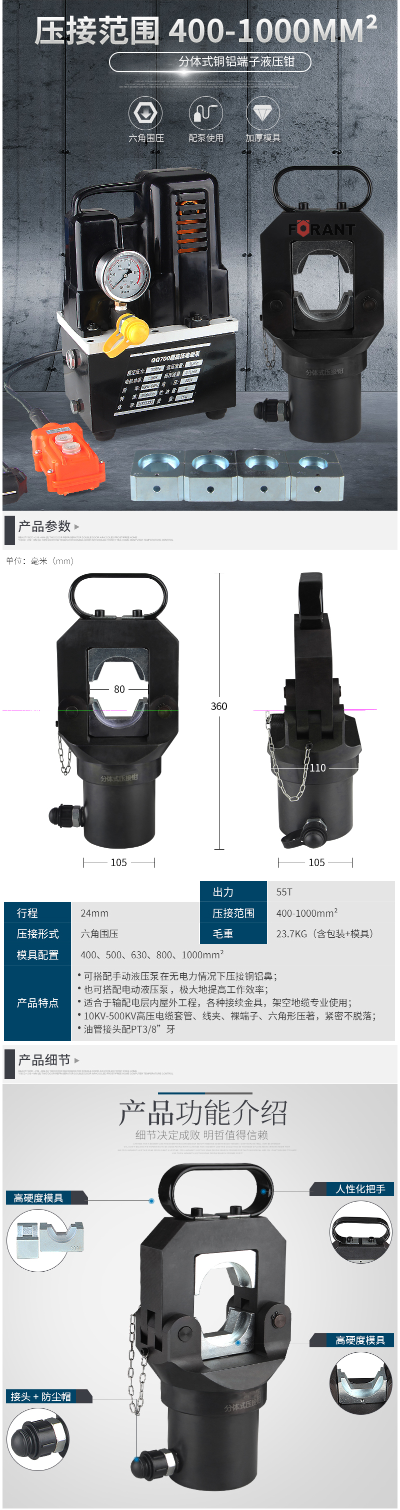 ·可搭配手动液压泵( CP-700)在无电力情况下压接铜铝鼻 ·也可搭配电动液压泵( DYB-63A、QQ-700 )极大地提高工作效率 ·适合于输配电层内屋外工程,各种接续金具,架空地缆专业使用 ·10KV-500KV高压电缆套管、线夹、裸端子、六角型压著,紧密不脱落 ·油管接头配3/8 "牙