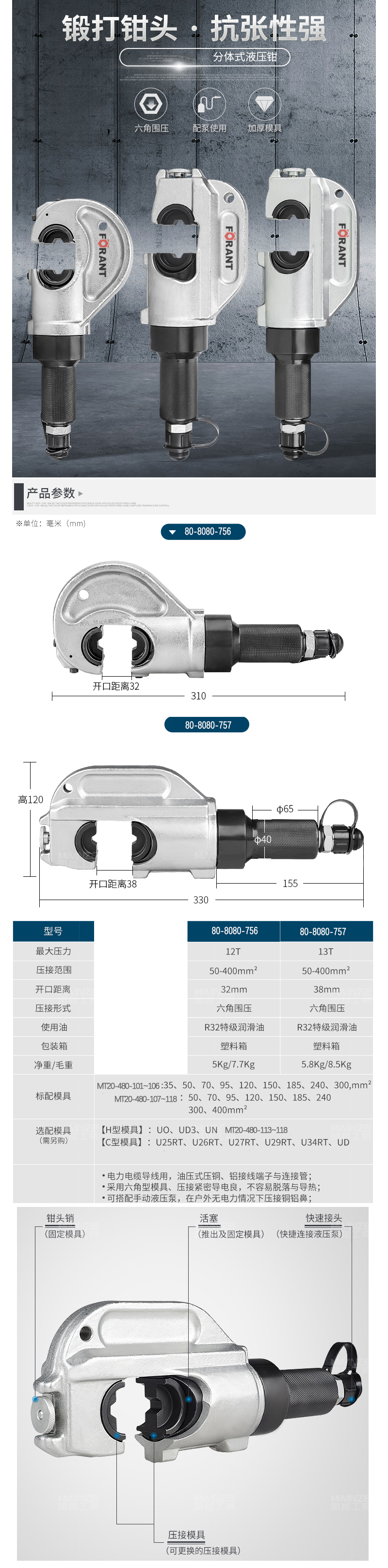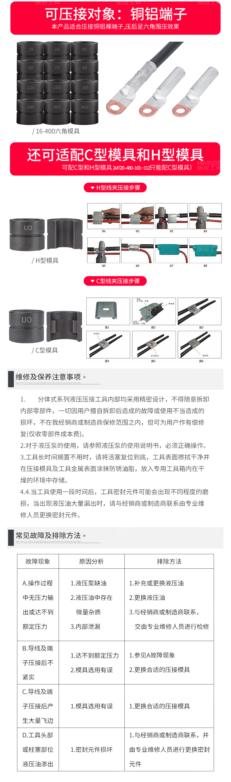 ·可搭配手动液压泵( CP-180、CP-700)在无电力情况下压接铜铝鼻 ·也可搭配电动液压泵( DYB-63A、QQ-700 )极大地提高工作效率 ·适合于输配电层内屋外工程,各种接续金具,架空地缆专业使用 ·10KV-500KV高压电缆套管、线夹、裸端子、六角型压著,紧密不脱落 ·油管接头配3/8 "牙