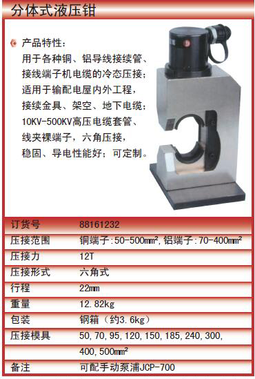 ·产品特性:用于各种铜、铝导线接续管、接线端子机电缆的冷态压接;适用于输配电屋内外工程,接续金具、架空、地下电缆;10KV-500KV高压电缆套管、线夹裸端子,六角压接,稳固、导电性能好;可定制。