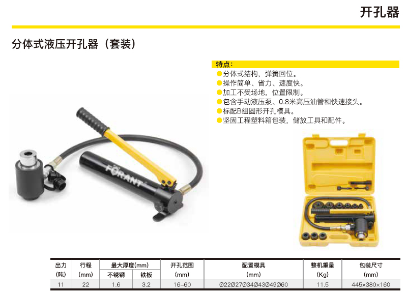 ·分体式结构, 弹簧回位。 ·操作简单、省力、速度快。 ·加工不受场地,位置限制。 ·包含手动液压泵、0·8米高压油管和快速接头。 ·标配B组圆形开孔模具。 ·坚固工程塑料箱包装,储放工具和配件。