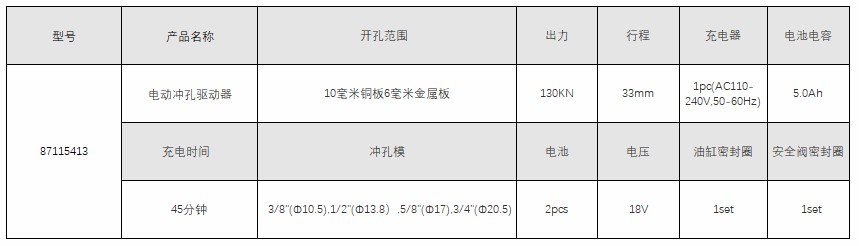 A35226 87115413 130KN -  10毫米铜板6毫米金属板 - -  33mm  18V  5.0Ah  45分钟 3/8"(Φ10.5),1/2"(Φ13.8),5/8"(Φ17),3/4"(Φ20.5)  2pcs  1pc(AC110-240V,50-60Hz)  1set    1set 21600.00