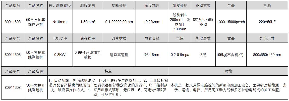 A31566 80911608 4-50mm2 线头剥1-200mm,线尾剥1-100mm Φ16mm 4-50mm² 0.1-99999.99mm ≤0.2%mm 8轮独立伺服驱动 1000-15000pcs/h 220V50HZ 0.3KW 0-99种线缆加工数据 进口高速钢 Φ6-18mm 0.2-0.6mpa 3层 105kg(不含机柜) 800×650×450mm 本机是一款采用微电脑控制的新型电缆加工设备,主要针对新能源、光伏、通讯、电控、所用高压动力线和多芯护套电缆线的加工难题; 122500.00