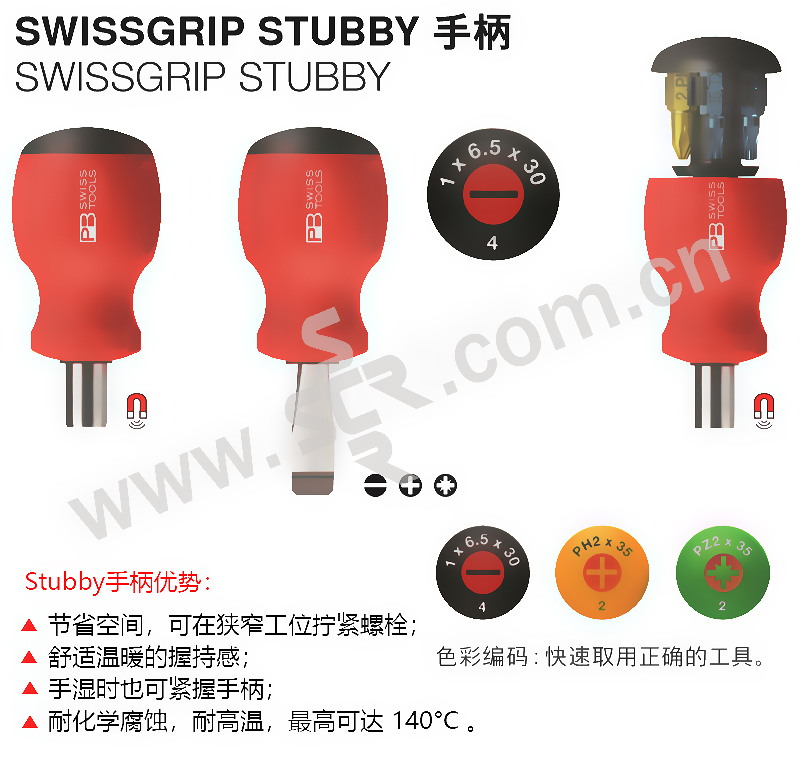 ·100%瑞士制造·基于弹簧钢而专门研制的特殊合金,韧性强,独特的弹性·高精度,确保耐用·一目了然,借助色彩对适用的螺栓型号和尺寸进行编码,使用者可以快速找到正确的工具。·细长手柄,带有亲肤、柔软的弹性包覆层可将手动产生的高扭矩轻松传递给螺栓,手柄的表面结构令使用者在手湿时也可紧握手柄。耐化学腐蚀,耐高温,可达140°C.·用于快速转动、微调工作,节省空间