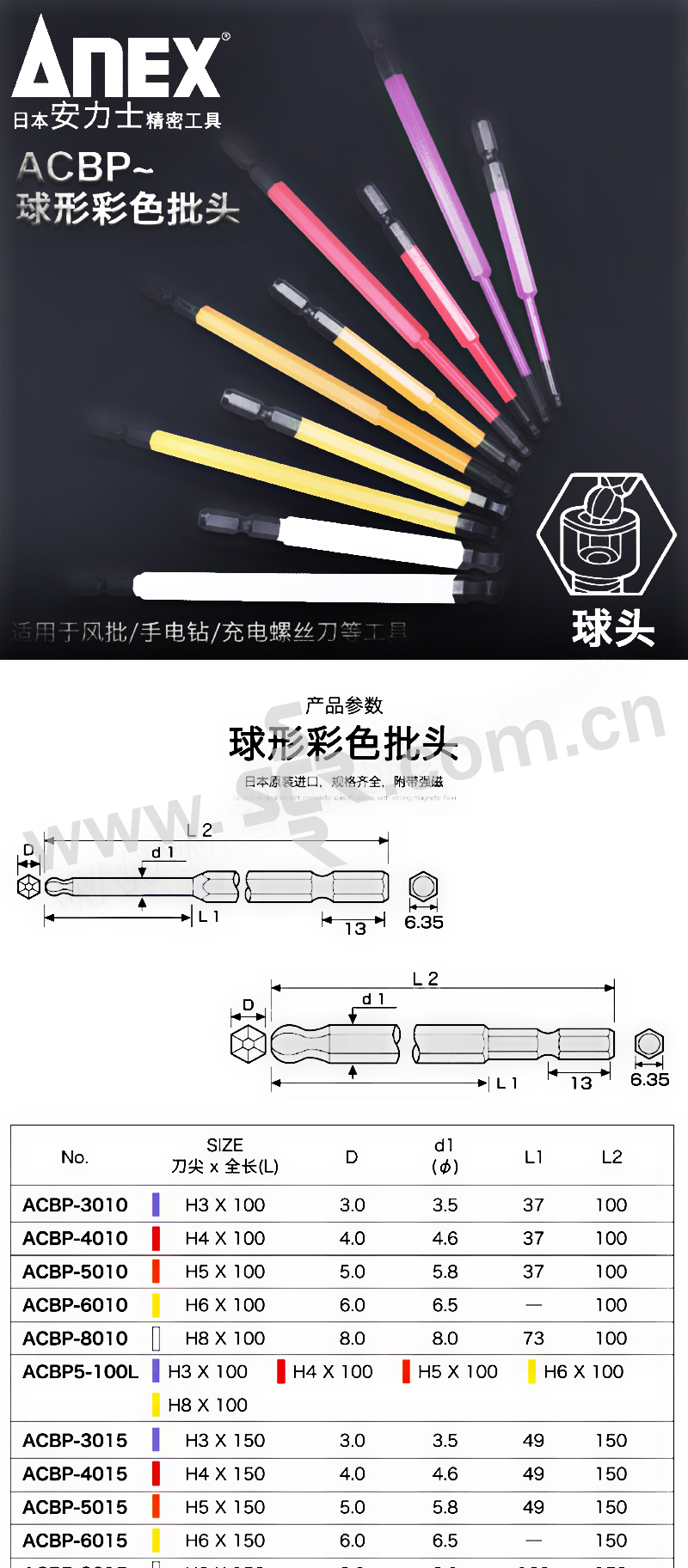 ANEX/安力士牌 进口球头内六角彩色批头 ACBP5-150L H3 H4 H5 H6 H8 5支 1套