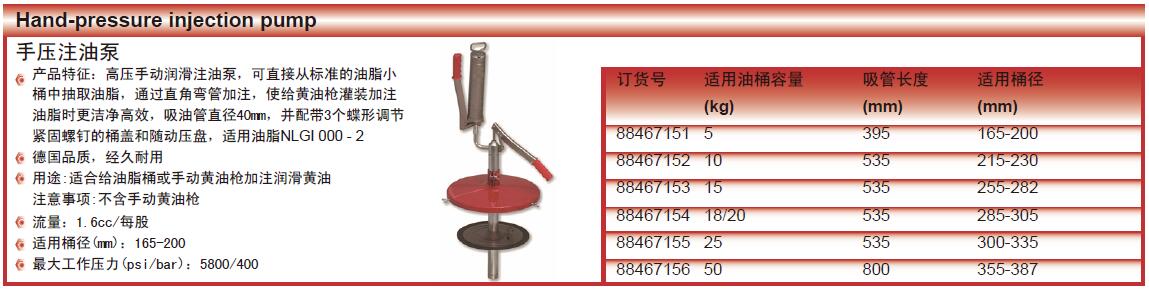 ·高压手动润滑注油泵,可直接从标准的油脂小 ·桶中抽取油脂,通过直角弯管加注,使给黄油枪灌装加注 ·油脂时更洁净高效,吸油管直径40mm,并配带3个蝶形调节 ·紧固螺钉的桶盖和随动压盘,适用油脂NLGI000-2 ·德国品质,经久耐用 ·注意事项:不含手动黄油枪流量:1.6cc/每股 ·适用桶径(mm):165-200 ·最大工作压力(psi/bar):5800/400
