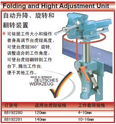 ·可依据工件大小和操作 ·者身高调节台虎钳高度。 ·可使台虎钳360°旋转, ·调整适合的工作角度。 ·可使台虎钳翻转到工作 ·台下,腾出工作台, ·便于其他工作