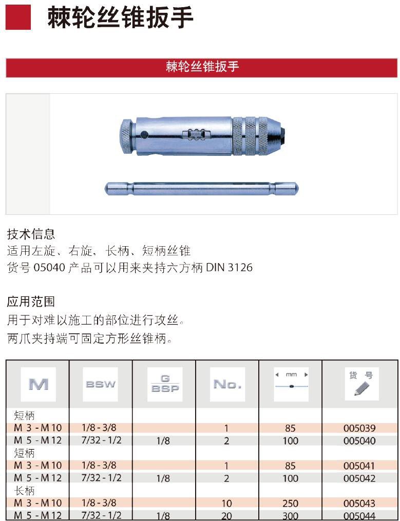 ·经久耐用,产品物美价廉 ·短柄,用于难以施工的部位进行攻丝,两爪夹持端可固定方型丝锥柄