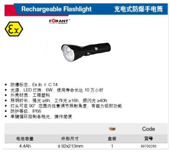 ·防爆标志:E× ib Ⅱ C T4 ·光源:LED 灯珠,6W,使用寿命长达10 万小时 ·外壳材质:工程塑料 ·照明时长:强光 8h,工作光 16h,频闪光 40h ·灯头可在90°范围内任意调节照射角度;有磁力吸附功能 ·防护等级:IP66 ·单键循环控制各档光、操作简便