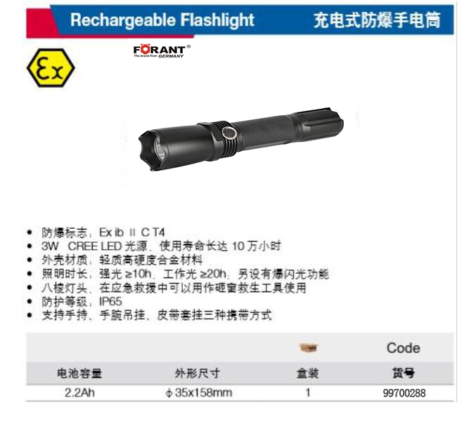 · 防爆标志:E× ib Ⅱ C T4 ·3W CREE LED 光源,使用寿命长达10 万小时 ·外壳材质:轻质高硬度合金材料 ·照明时长:强光 10h,工作光 20h;另设有爆闪光功能 ·八棱灯头,在应急救援中可以用作砸窗救生工具使用 ·防护等级:IP65 ·支持手持、手腕吊挂、皮带套挂三种携带方式"